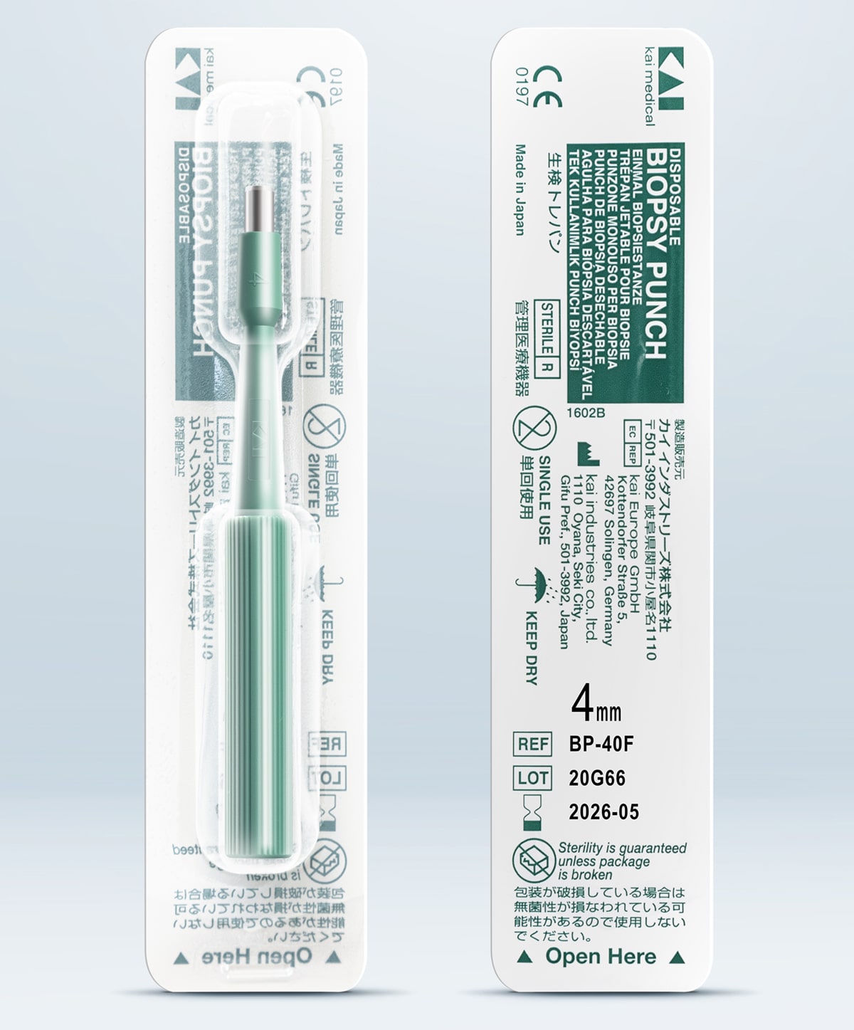 Superior cutting performance is essential for biopsy punches. KAI MEDICAL has devised a precisely designed grinding angle with special finishing for an ideal cutting edge. KAI MEDICAL succeeded in meeting the big challenge of producing punches with outstanding sharpness from a circular blade after long trials. The handles with embossed size and sure grip are designed to be user-friendly. Today KAI biopsy punches are used in a variety of applications such as the therapeutic or reconstructive field.
